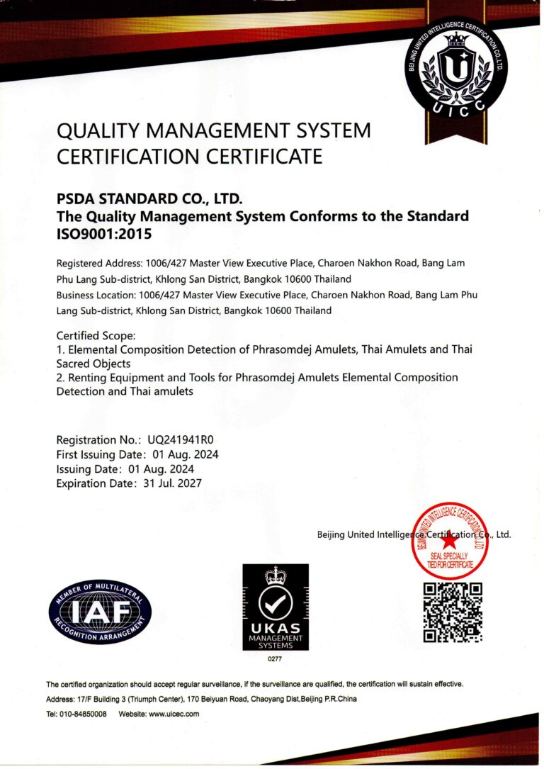 - การรับรองกระบวนการด้วยมาตรฐาน ISO: PSDA STANDARD ได้ดำเนินการจัดทำ มาตรฐาน ISO เพื่อรับรองกระบวนการทั้งหมด ตั้งแต่การตรวจสอบพระสมเด็จและวัตถุมงคลไทย การใช้เครื่องมือ ไปจนถึงกระบวนการประเมินมูลค่า (Price Assessment) จุดสำคัญคือ ไม่มีเครื่องมือใดเครื่องมือหนึ่งโดยเฉพาะที่จะใช้รับรองพระเครื่องได้ แต่ต้องอาศัย กระบวนการที่ออกแบบมาและได้รับการรับรองแล้วว่าสามารถตรวจสอบได้ ซึ่งเป็นสิ่งที่ต่างชาติให้ความสำคัญ
